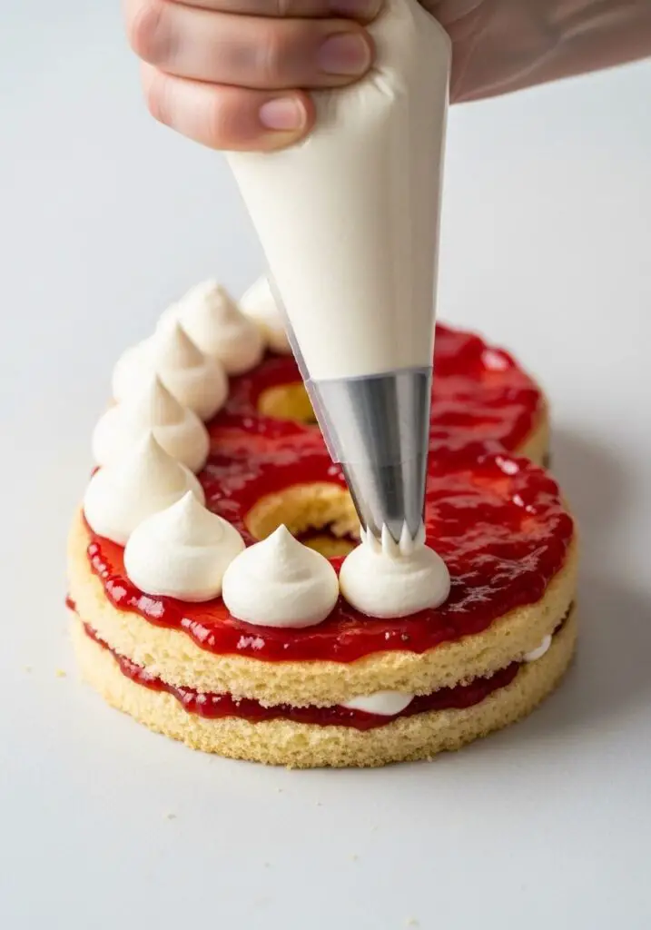 - Pipe the First Layer: Fill a piping bag fitted with a large round nozzle with your buttercream. Pipe large, neat, uniform dots (or kisses) of buttercream all over the jam layer.