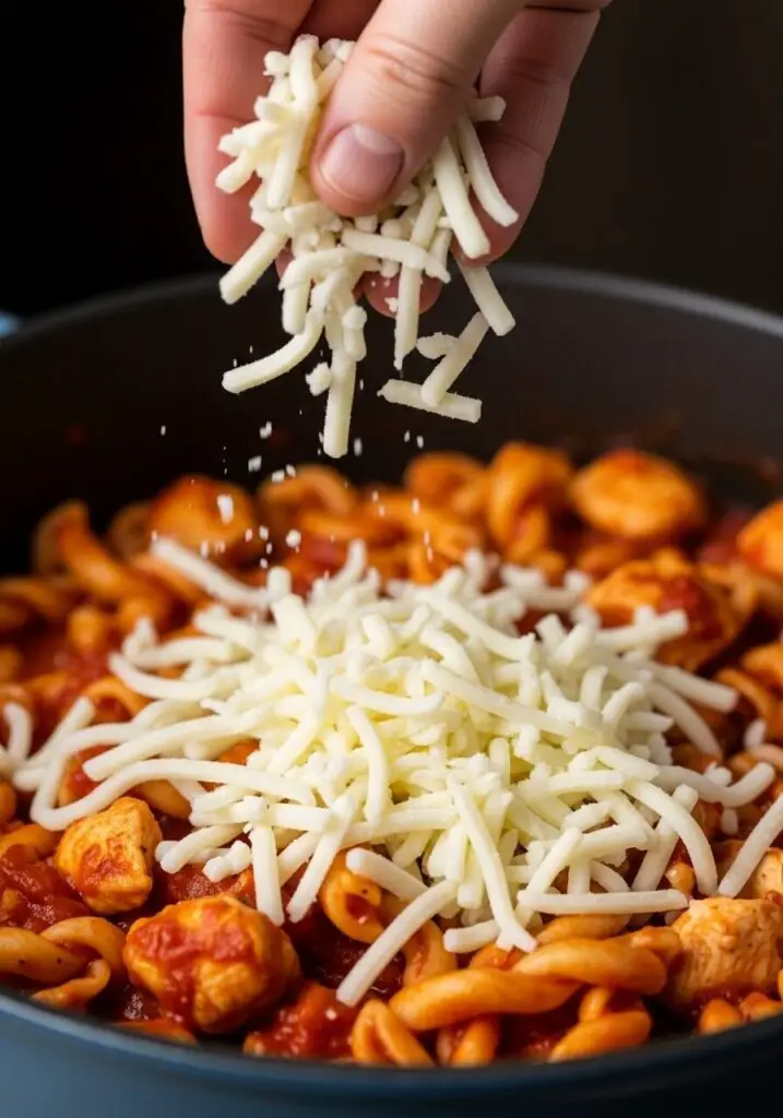 - Sprinkle the remaining 3/4 cup of mozzarella cheese over the top of the pasta. Cover the pot for 2-3 minutes to allow the cheese to melt.