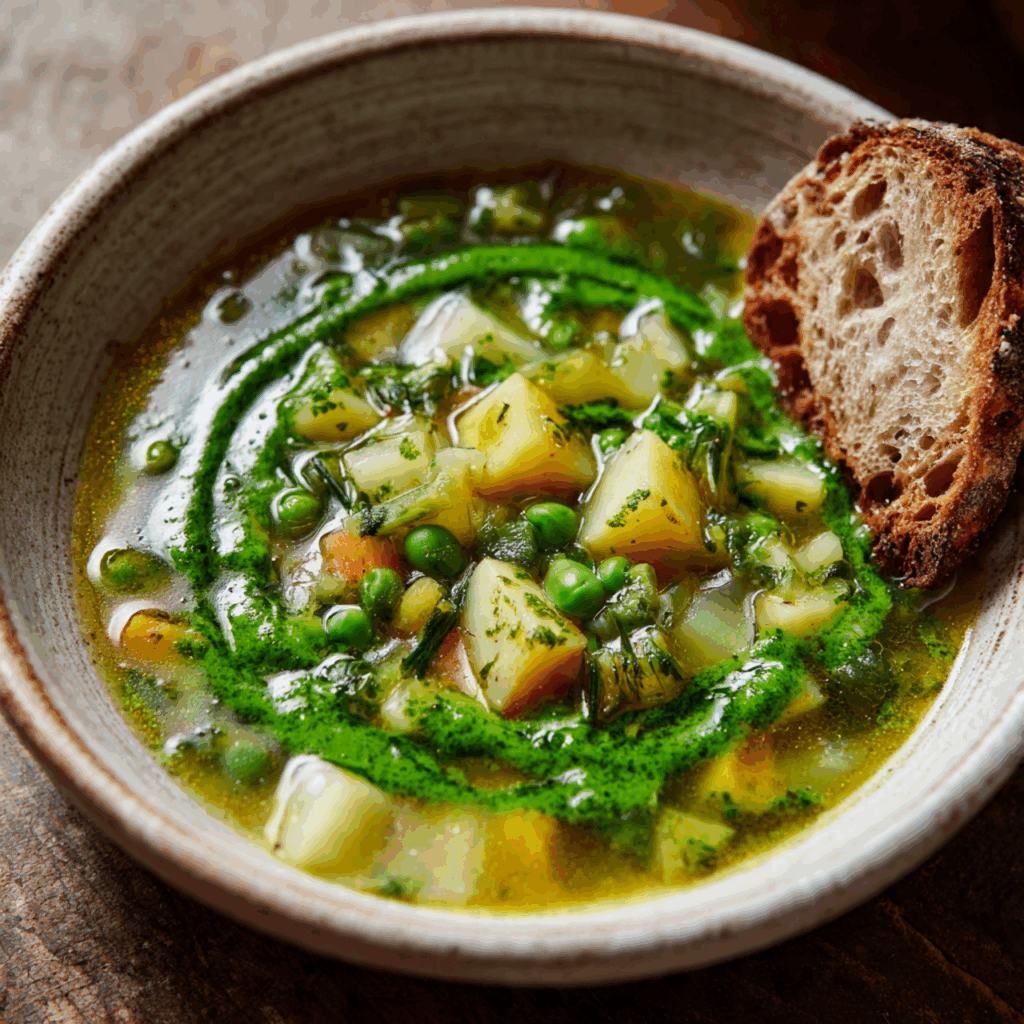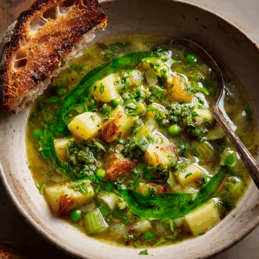 - Serve: Ladle the hot, chunky vegetable soup into four bowls. Just before serving, drizzle a generous spoonful of the fresh pistou over the top of each bowl.