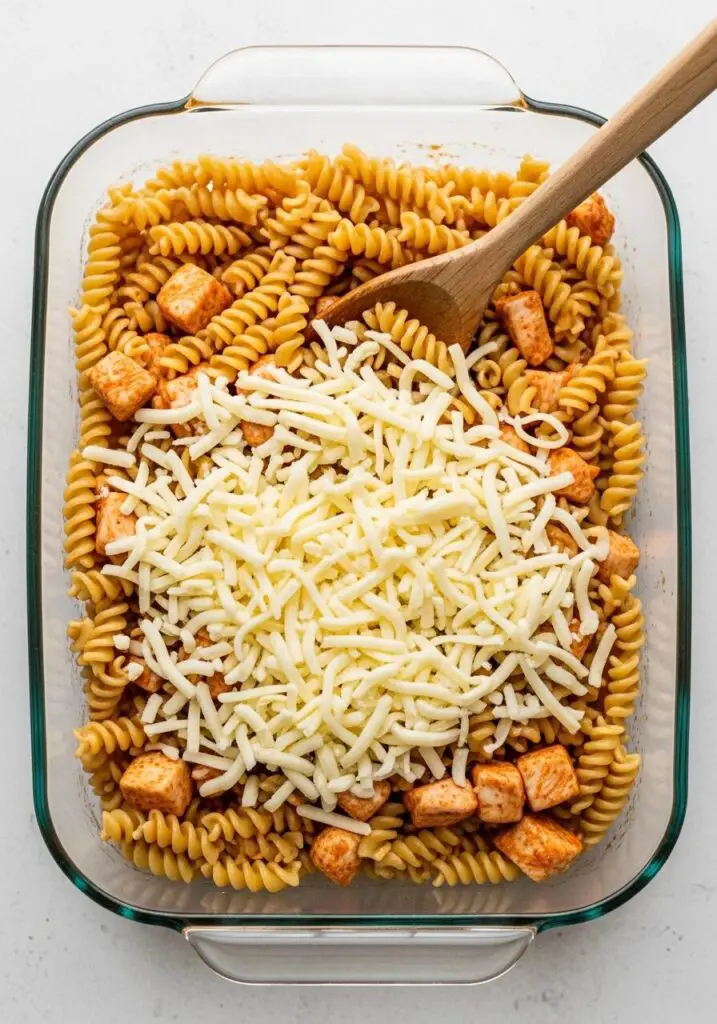 - Combine the Good Stuff: In a large casserole dish (a 9×9 or similar size works well), dump in the drained rotini, the cubed cooked chicken, and the shredded mozzarella cheese. Give it a good stir right in the dish to combine everything.