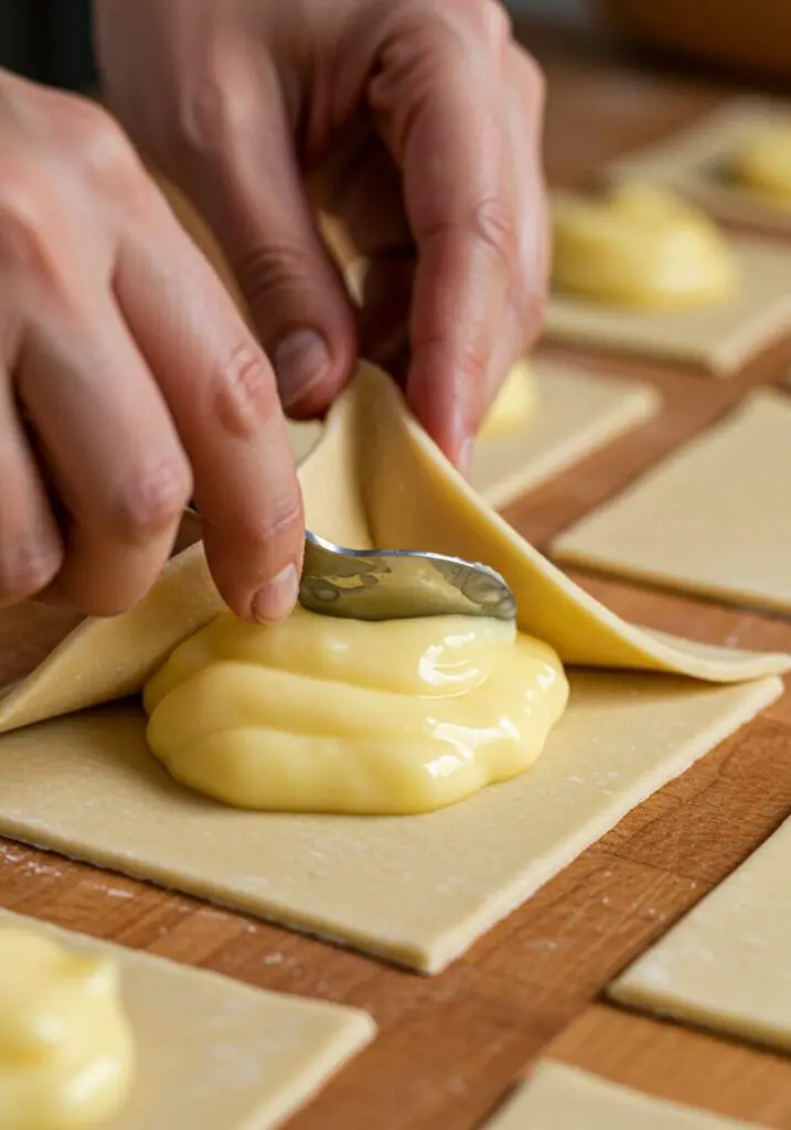 - Fill & Shape Pastries: Place a generous tablespoon of the ready-made custard into the middle of each pastry square. Brush the edges of the pastry with some of your additional beaten egg (our egg wash). Now, gently fold the pastry corners into the center, pressing firmly to enclose the filling and create that classic Danish shape. Place the pastries onto your lined baking sheet.