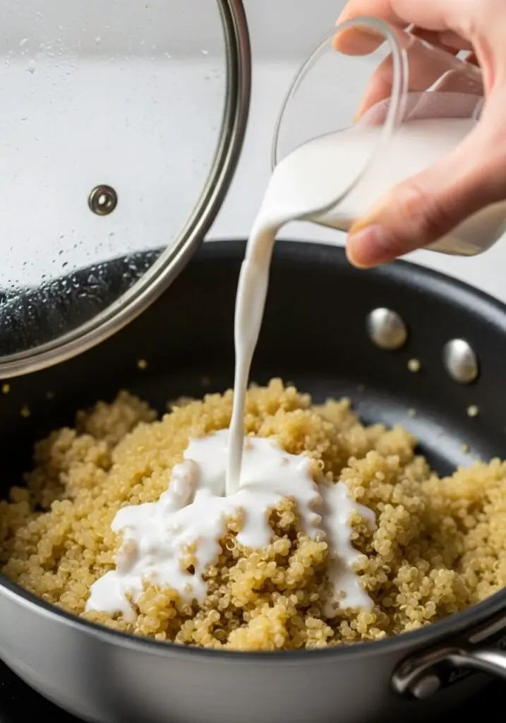 - Add the Creaminess. Stir in the coconut milk, cinnamon, and maple syrup. Continue to stir and cook over low heat for another 2-3 minutes as the quinoa absorbs the milk and the mixture becomes thick and creamy.
