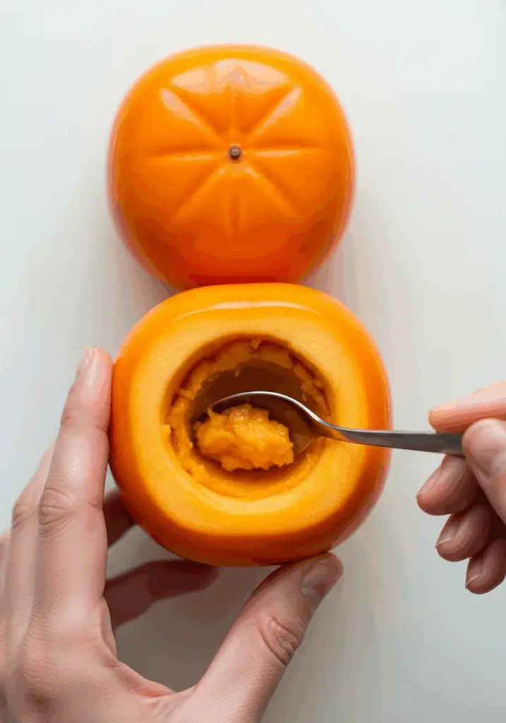 - Prepare the Persimmons: Carefully slice about ¼ inch off the top of each persimmon to create a “lid.” Using a sharp paring knife and a small spoon, gently hollow out a small portion of the flesh from the center, leaving about half of the interior flesh intact to create a little bowl.
