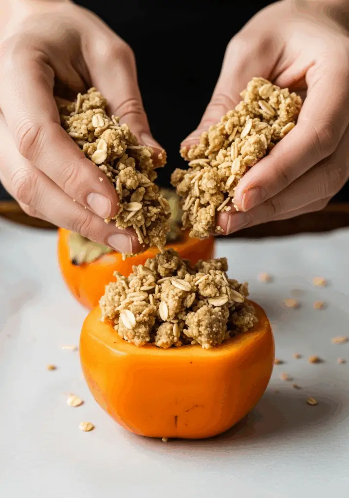 - Stuff and Bake: Place the hollowed-out persimmons on your prepared baking sheet. Generously stuff the centers of the persimmons with the oat crumble mixture, piling it high.