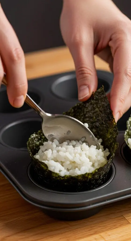 - Form the Nori Cups: Take your quartered nori sheets and place one in each of the 12 muffin cups. Scoop a heaping tablespoon of cooked sushi rice into the center of each nori sheet. Use the back of a wetted spoon to gently pack the rice into a flat, even layer at the bottom of each cup.