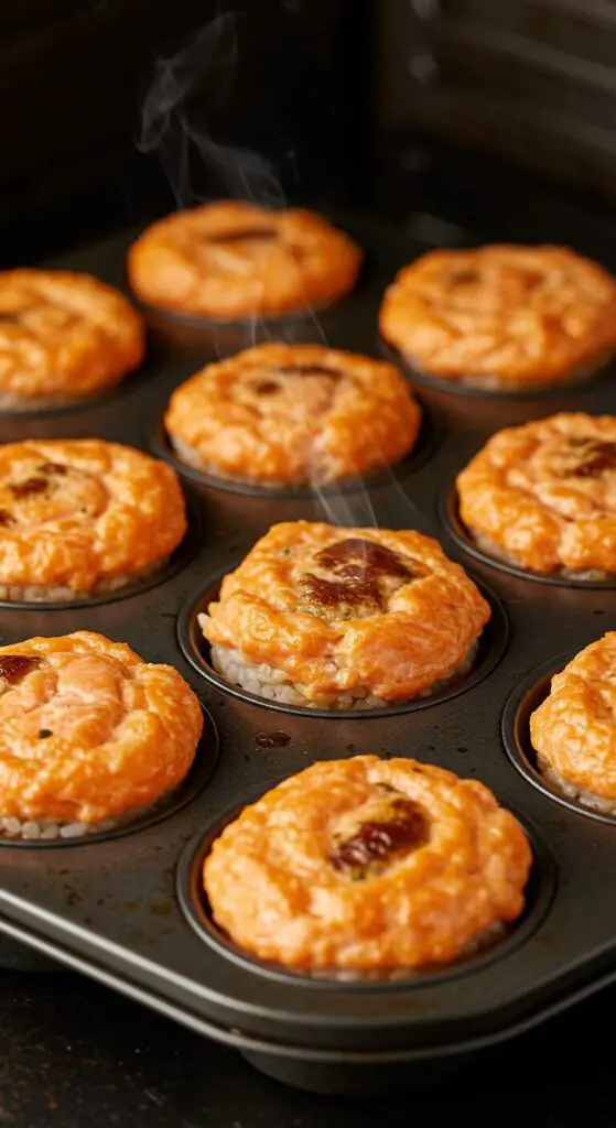 - Fill and Bake: Divide the salmon mixture evenly among the 12 muffin cups (it will be about 1/4 cup each), spooning it right on top of the rice layer. Bake for about 11 minutes, or until the salmon is almost cooked through.