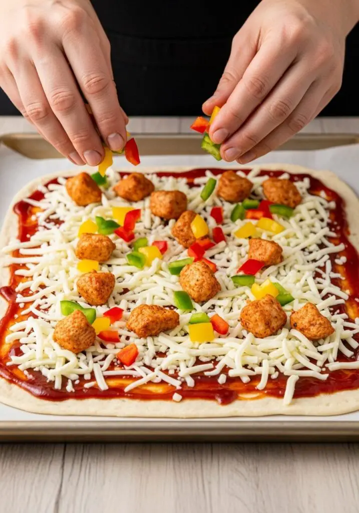 - Add the Toppings. Top the cheese with the diced chicken and the chopped bell peppers, distributing them evenly over both flatbreads.