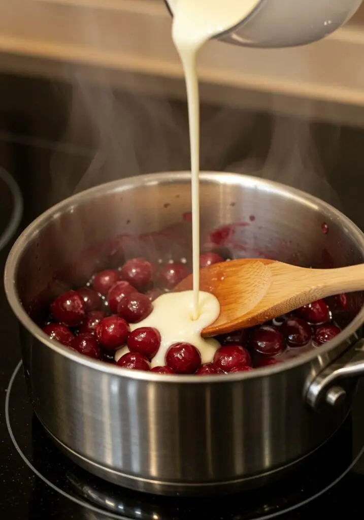 - Thicken Cherry Sauce: In a small bowl, whisk 2 tablespoons of cornflour with 1 tablespoon of water until smooth. Stir this cornflour mixture through the cherries in the pan, along with the ½ lemon, juiced, and 2 tablespoons of caster sugar. Reduce the heat to low and simmer for 2-3 minutes, stirring constantly, until the sauce has thickened nicely.