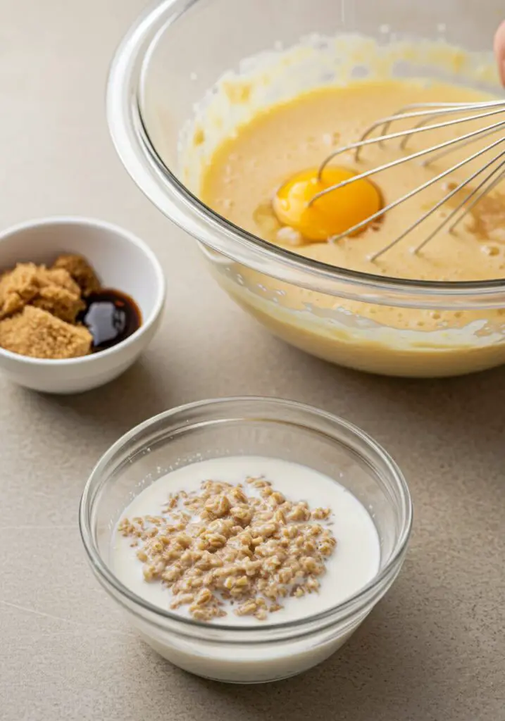 - Mix Wet Ingredients: In a large bowl, whisk together the 1 medium egg, 75g light brown sugar (reserving 1 tbsp for sprinkling!), and ½ tsp vanilla extract until well combined. Now, beat in your soaked bran and milk mixture until everything is thoroughly incorporated.