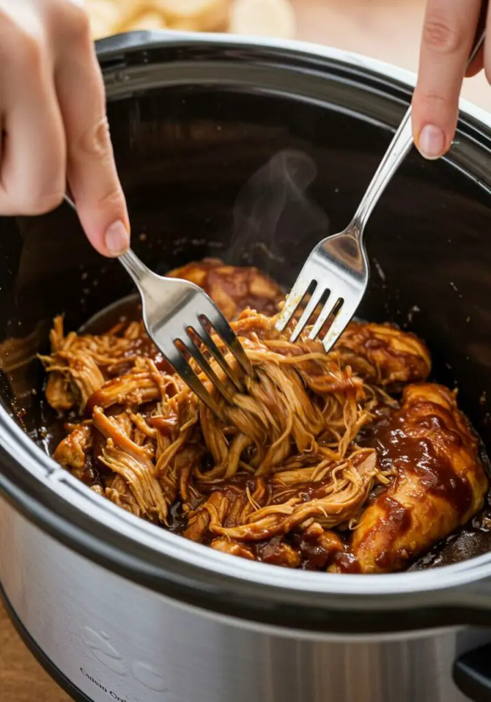 - Shred chicken directly in the slow cooker using two forks. Stir until well coated in sauce.