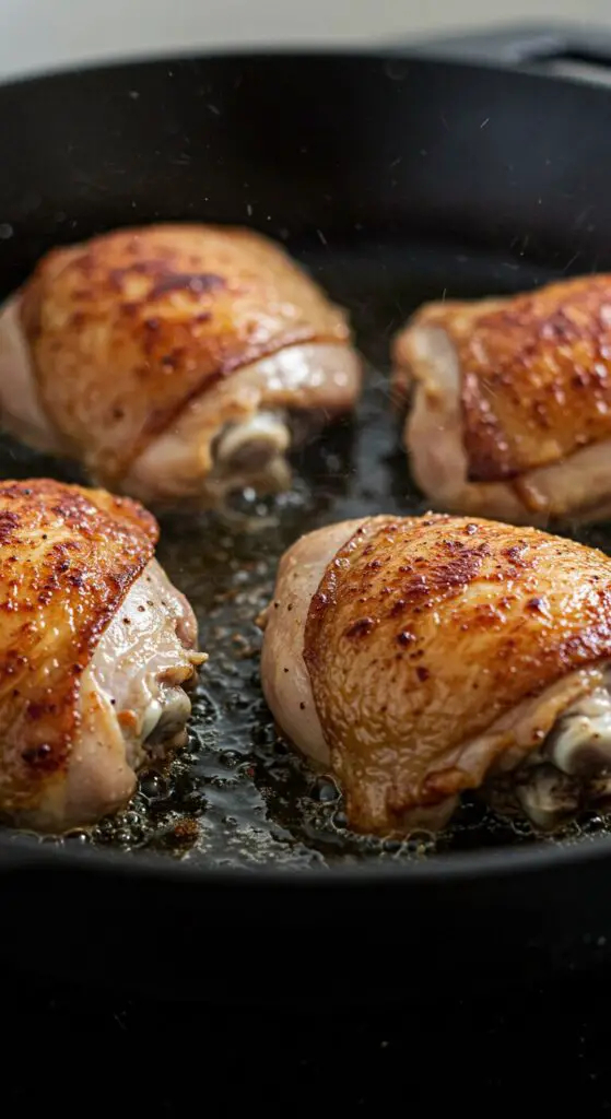 - Sear the Chicken: Place a 10-inch oven-proof skillet (cast iron is perfect) over medium-high heat. Place the chicken thighs in the hot skillet, skin-side down. Sear them for 3-5 minutes, without moving them, until the skin is lightly browned and crispy.