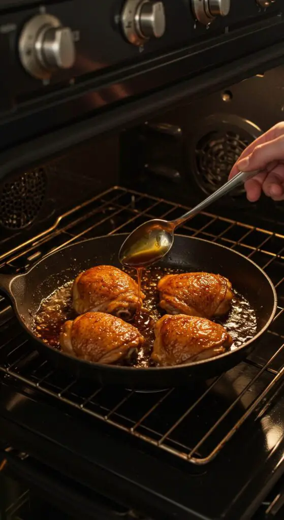 - Glaze and Bake: Carefully transfer the chicken to a plate. Pour off any excess drippings from the skillet. Place the chicken thighs back into the pan, this time skin-side up. Pour the prepared soy sauce mixture all over the chicken.
