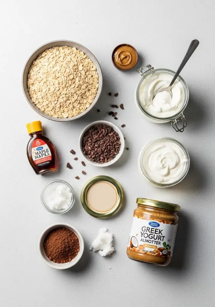 - Mix it All Up: In a large bowl, whisk together the rolled oats, almond milk, Greek yogurt, almond butter, chia seeds, cocoa powder, maple syrup, vanilla, and salt. Keep whisking until everything is smooth and well combined, with no lumps of cocoa or almond butter.