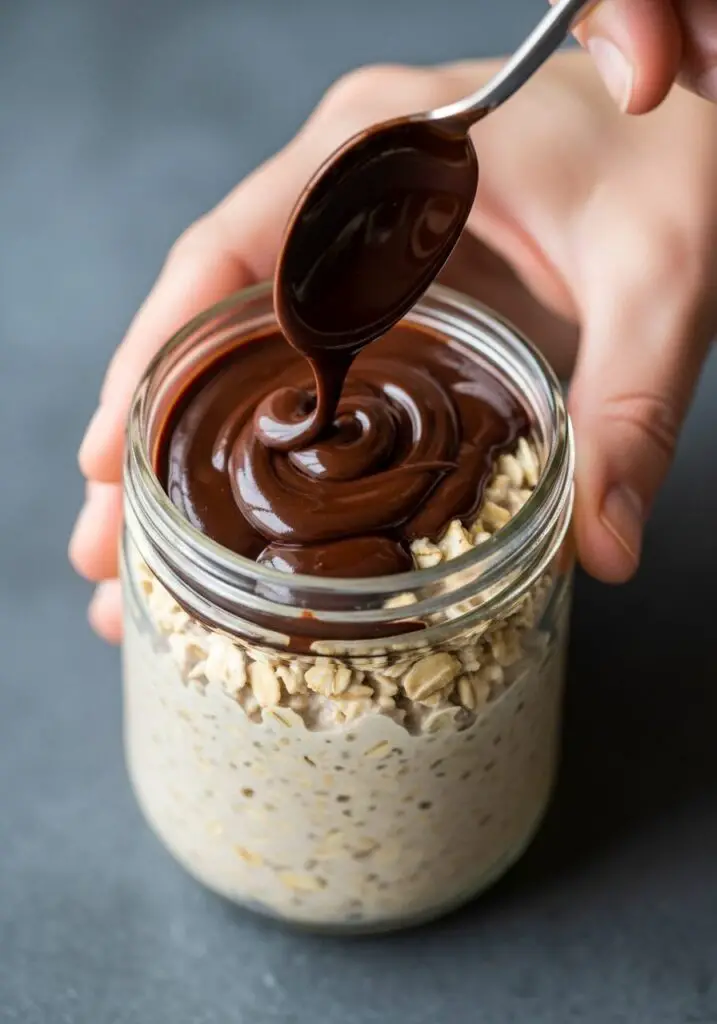 - Top it Off: Spoon about 2 teaspoons of the melted chocolate mixture over the top of the oats in each jar. Gently tilt the jar to help the chocolate spread out and cover the entire surface.