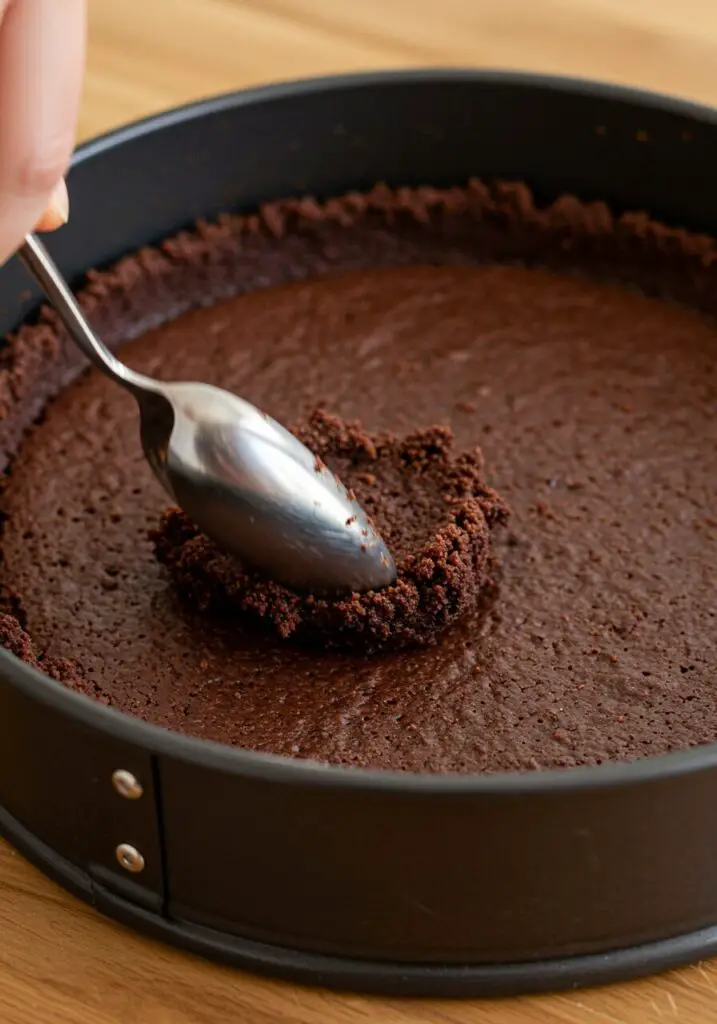 - Bake and Form the Crust: Pour the brownie batter into your prepared pan and bake for about 45 minutes, until a toothpick comes out clean. While the brownie is still hot from the oven, use the back of a spoon to gently press it down and compact it into an even crust that comes about halfway up the sides of the pan. Let this crust cool completely on a wire rack.