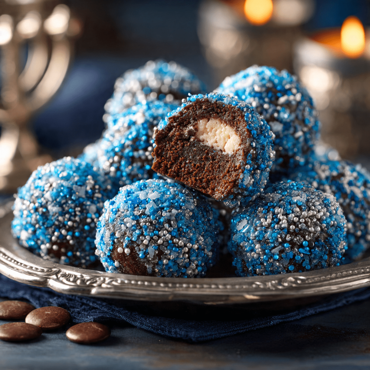 I promise you, there is no greater party treat. The flavor is a perfect symphony of rich, deep chocolate and the bright tang of cheesecake, all in one perfect, pop-able bite. They are a fantastic project to make with kids and look absolutely stunning on a holiday platter, especially when rolled in festive blue and white sprinkles for Hanukkah.