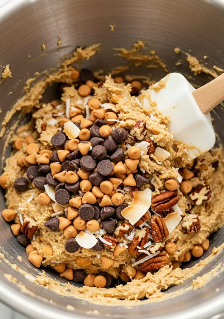 - Gently fold in the butterscotch chips, chocolate chips, coconut, and pecans.