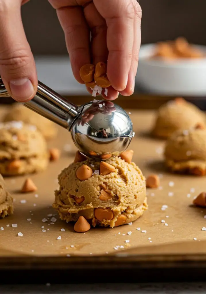 - Scoop and Prep the Dough: Use a large cookie scoop (about 2 ounces or 4 tablespoons) to portion out balls of dough. Place them on your prepared baking sheet, several inches apart to allow for spreading. For a bakery-style look, press a few extra butterscotch and chocolate chips onto the tops of the dough balls. If you’re a fan of salty-sweet, now is the time to sprinkle them with a little flaky sea salt.