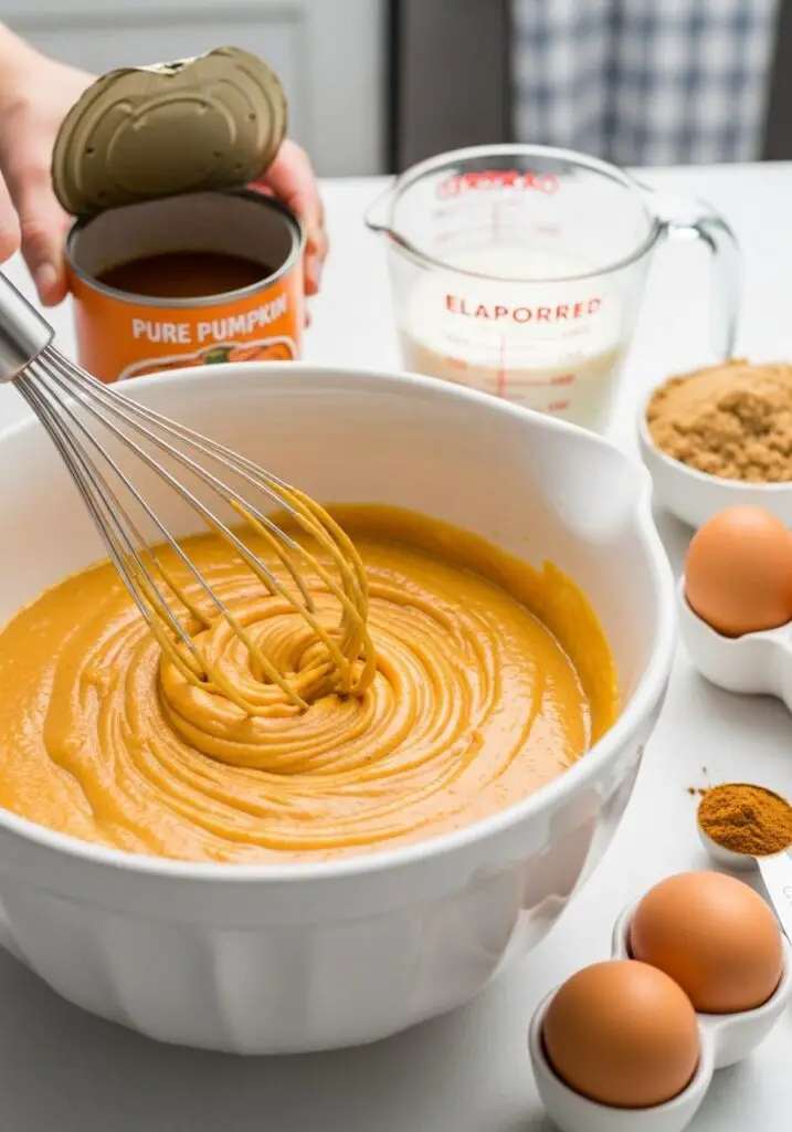 - Mix Pumpkin Base: In a large bowl, combine the 15-ounce can of pure pumpkin, 10-ounce can of evaporated milk, 1 cup of light brown sugar, 3 eggs, and 3 teaspoons of pumpkin pie spice. Stir everything well until all the ingredients are thoroughly combined and smooth.