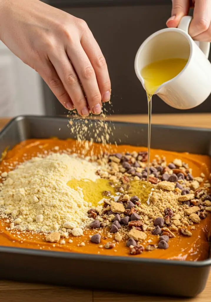 - Cream Cheese Swirl: For an extra decadent layer, soften 4 ounces of cream cheese and mix with ¼ cup powdered sugar and 1 tsp vanilla. Dollop spoonfuls over the pumpkin base before sprinkling the cake mix.