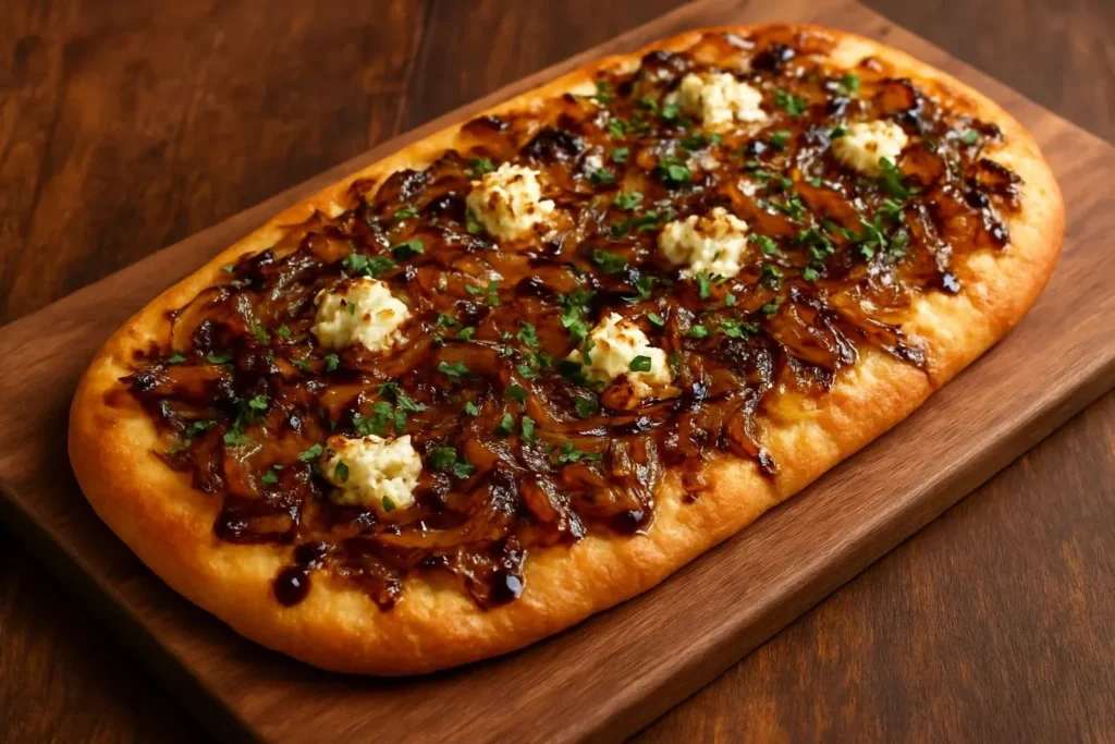 There is a small memory that always makes this dish feel cozy to me. My grandmother used to make onion pie with a different cheese, and the first time I made this flatbread I realized how a handful of simple ingredients and careful time at the stove could produce that same comforting, grown-up flavor. I think that’s why I love this recipe: it demands nothing complicated but rewards patience with depth.