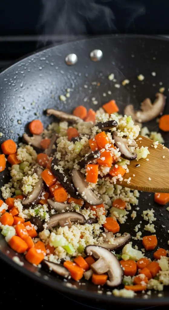 - Sauté the Veggies: Heat the avocado oil in a large nonstick skillet or wok over medium heat. Add the sliced shiitake mushrooms, diced carrot, and salt. Cook, stirring occasionally, for about 8 minutes, until the mushrooms are browned and the carrots have softened.