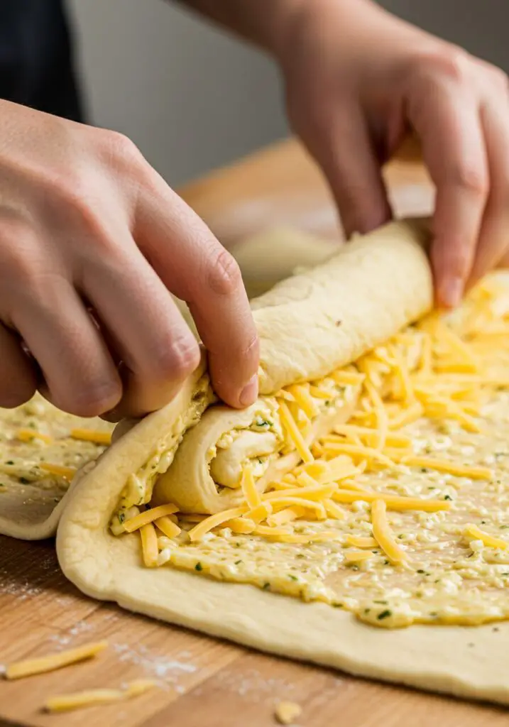 - Spread the Filling: Spread about ⅓ of the garlic-chive butter mixture evenly over the top of the entire sheet of dough. Sprinkle 1 cup of the shredded cheddar cheese evenly over the butter.