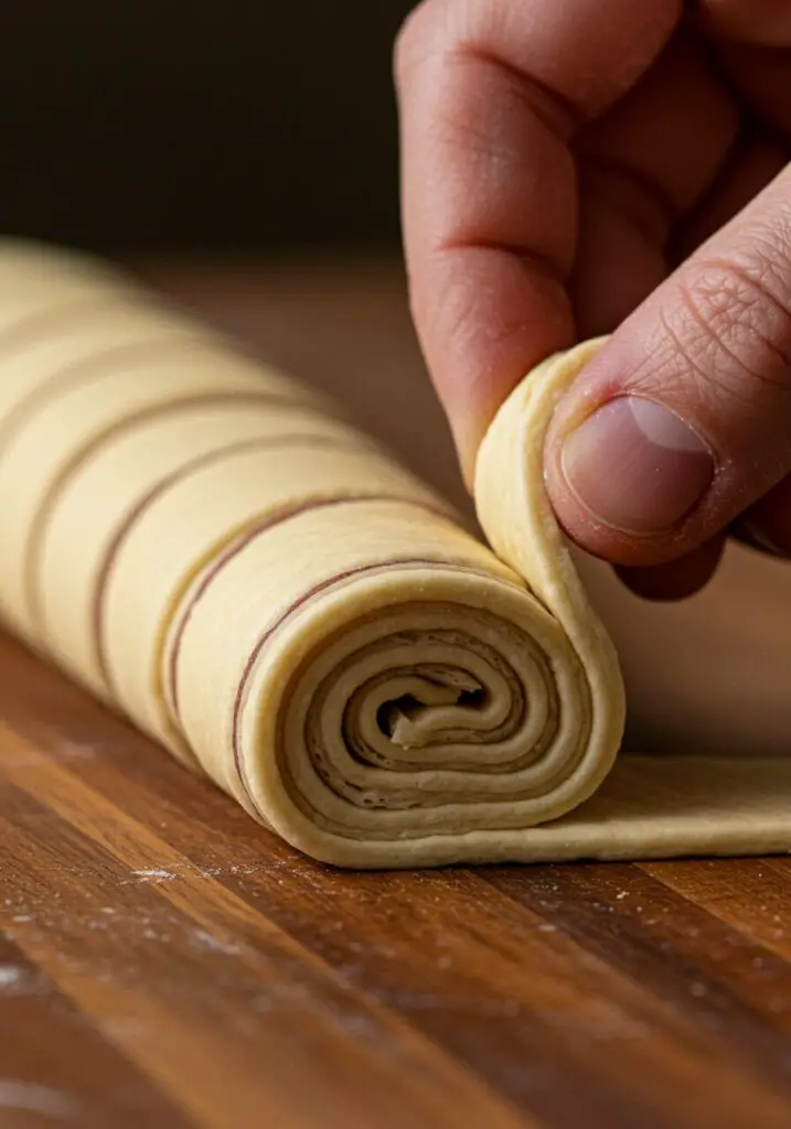 - Roll and Cut the Log: Starting on the long end of the dough sheet, tightly roll it up into a long log. Cut the log in half crosswise, creating two shorter, thicker logs.
