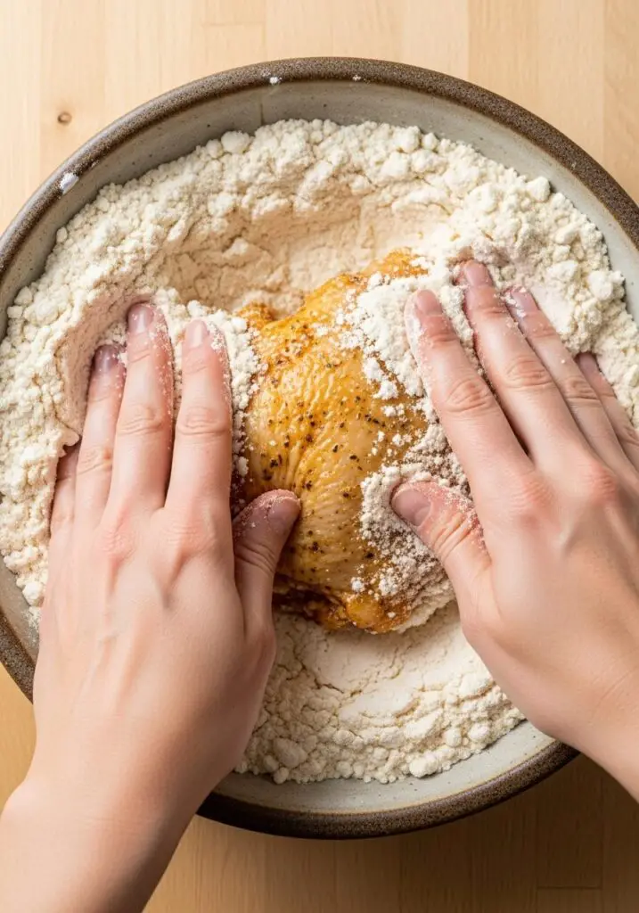 - Dredge the Chicken: Working with one piece at a time, remove a chicken thigh from the marinade, let any excess drip off, and dredge it thoroughly in the prepared flour mixture. Pat the flour firmly onto the chicken to create a thick, even coating. Place the coated chicken on a plate and repeat with the remaining pieces.