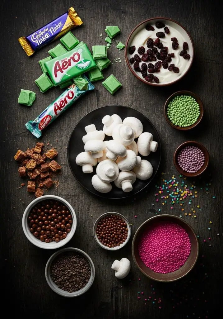 - An assortment of your favorite mint chocolates (like Aero Peppermint, Mint Chocolate Balls, Peppermint Crisp), chocolate flakes (like Cadbury Flake), yogurt-coated craisins, chocolate pearls, and colored sugar crystals.