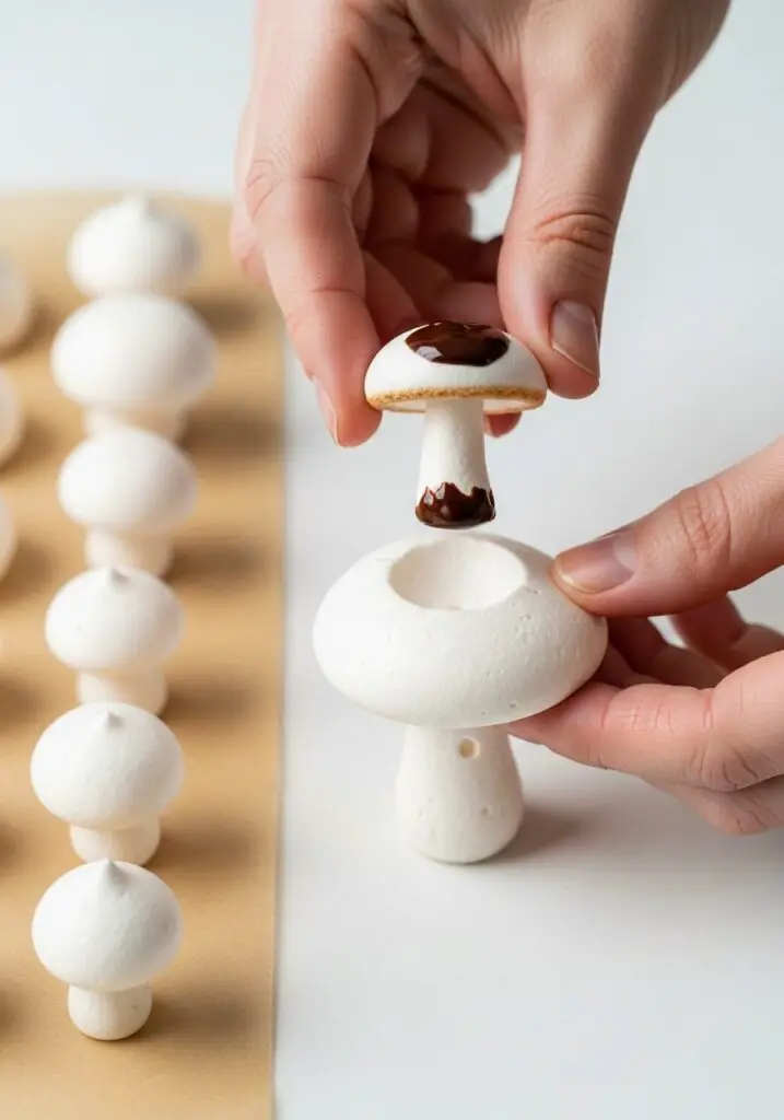 - Assemble the Mushrooms: Once cool, dab a little melted chocolate on the flat tops of the “stalks” and use it as glue to attach the “caps.” Dust with a little cocoa powder for a realistic, earthy look.