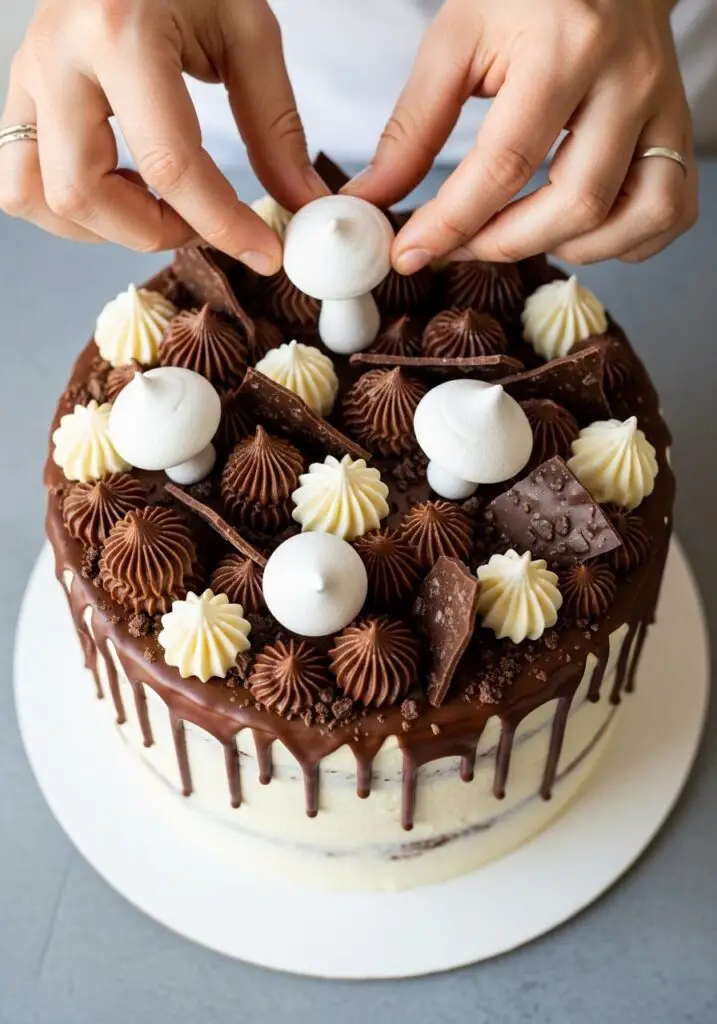 - Create Your Forest!: Use your reserved buttercream to pipe little peaks on top of the cake. Now for the best part—get creative! Arrange your meringue mushrooms, chocolate shards, and other edible goodies on top to create your own magical, enchanted forest scene.