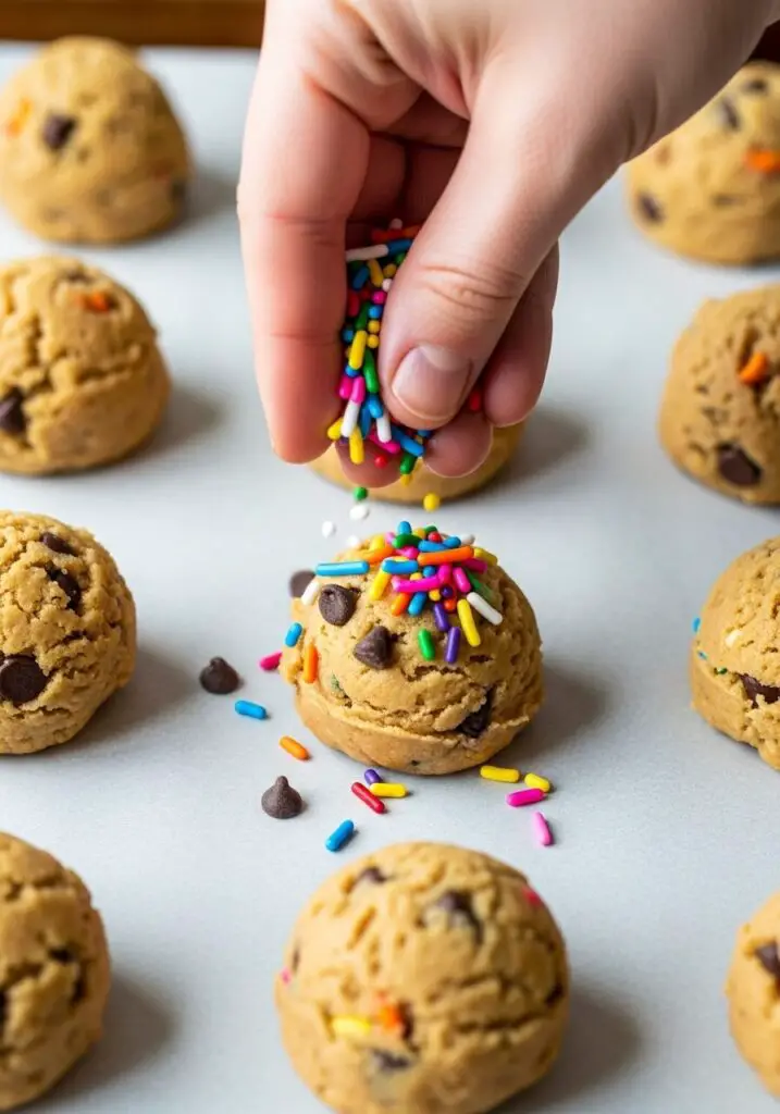- Scoop the Dough: Use a cookie scoop or a spoon to portion the dough into 3-tablespoon-sized balls. Place them on the prepared cookie sheets, about 2-3 inches apart to give them room to spread. For an extra pop of color, you can press a few more sprinkles and chocolate chips onto the tops of the dough balls.