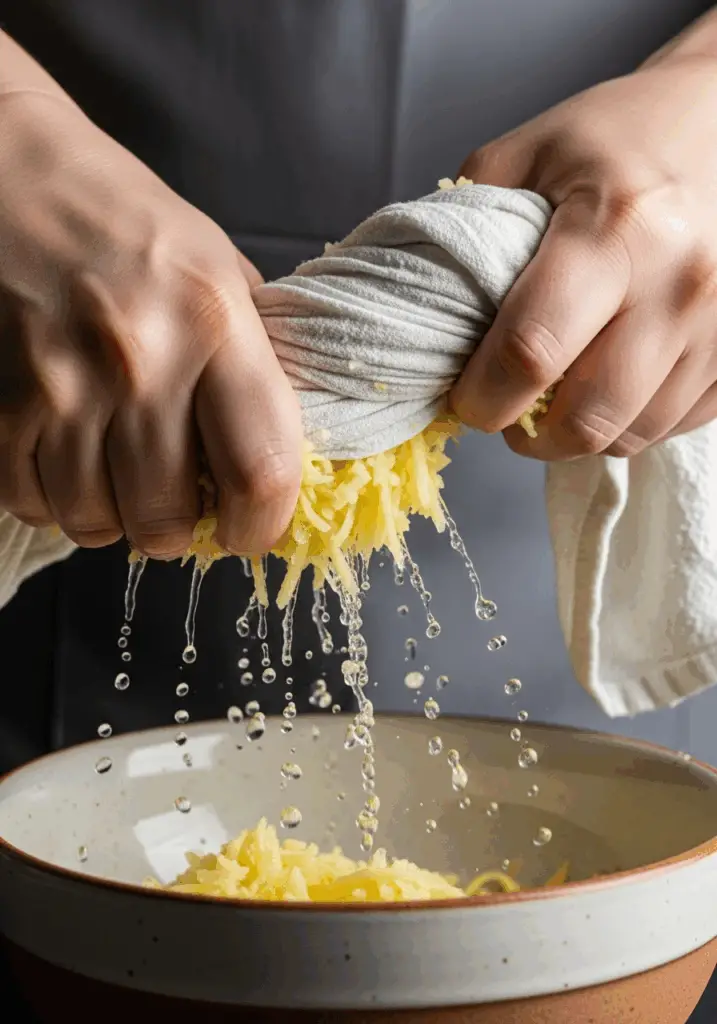 - Grate and Squeeze: Peel and grate the potatoes using a cheese grater or a fine-hole mandolin. Place the grated potato onto a clean kitchen towel or several layers of paper towels. Now, the most important step: gather the towel and squeeze as much liquid out of the potatoes as you possibly can.