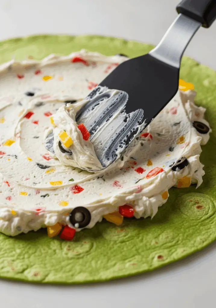 - Spread the Filling: Divide the cream cheese mixture evenly among the four green tortillas. Using an offset spatula, spread the mixture on each tortilla in a smooth, even layer, leaving about a ½-inch border clear around the edges.
