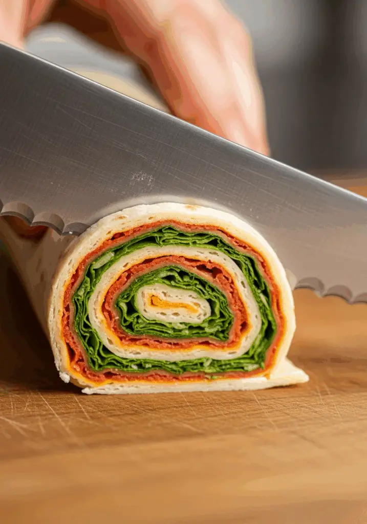 - Slice the Pinwheels: Once firm, place a tortilla log on a cutting board. Using a sharp serrated knife, slice the log into uniform ½-inch thick pinwheels. The ends might be a bit uneven, so feel free to save those for the chef!