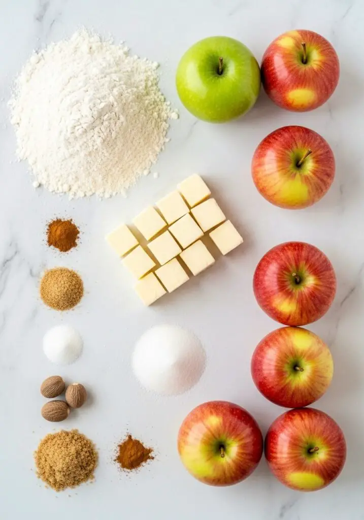 - 4 large apples → Peeled and sliced 1/4″ thick. Use a mix of firm-tart and firm-sweet apples like Granny Smith and Honeycrisp.