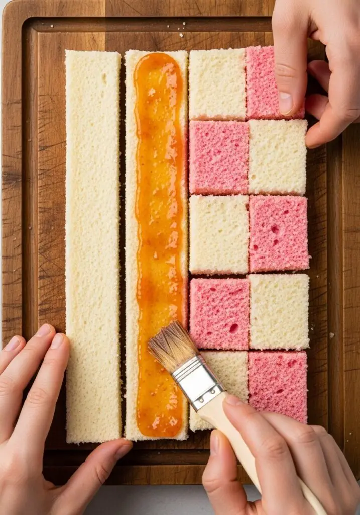 - Cover in Jam: Spread a thin layer of warm apricot jam over all four long sides of your completed checkerboard cake.