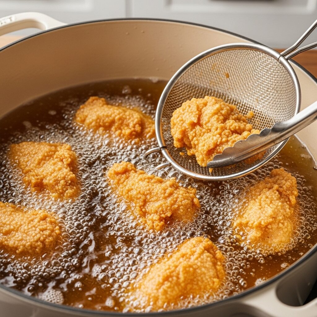 - Drain Chicken: Once cooked, use a spider strainer or slotted spoon to remove the fried chicken nuggets from the oil. Let them drain on a wire rack set in a baking sheet lined with foil or paper towels to catch any excess oil. Keep warm.
