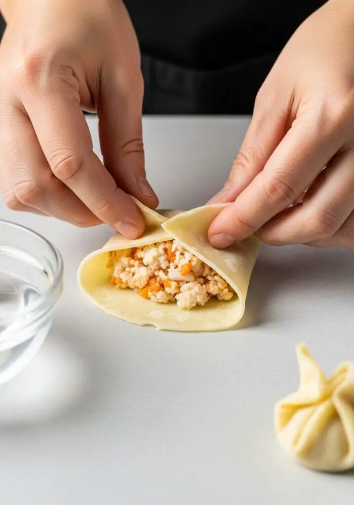 - Seal and Fold. Dip your finger in the small bowl of water and brush all four edges of the wrapper. Fold the bottom corner up and over the filling, pressing down gently.