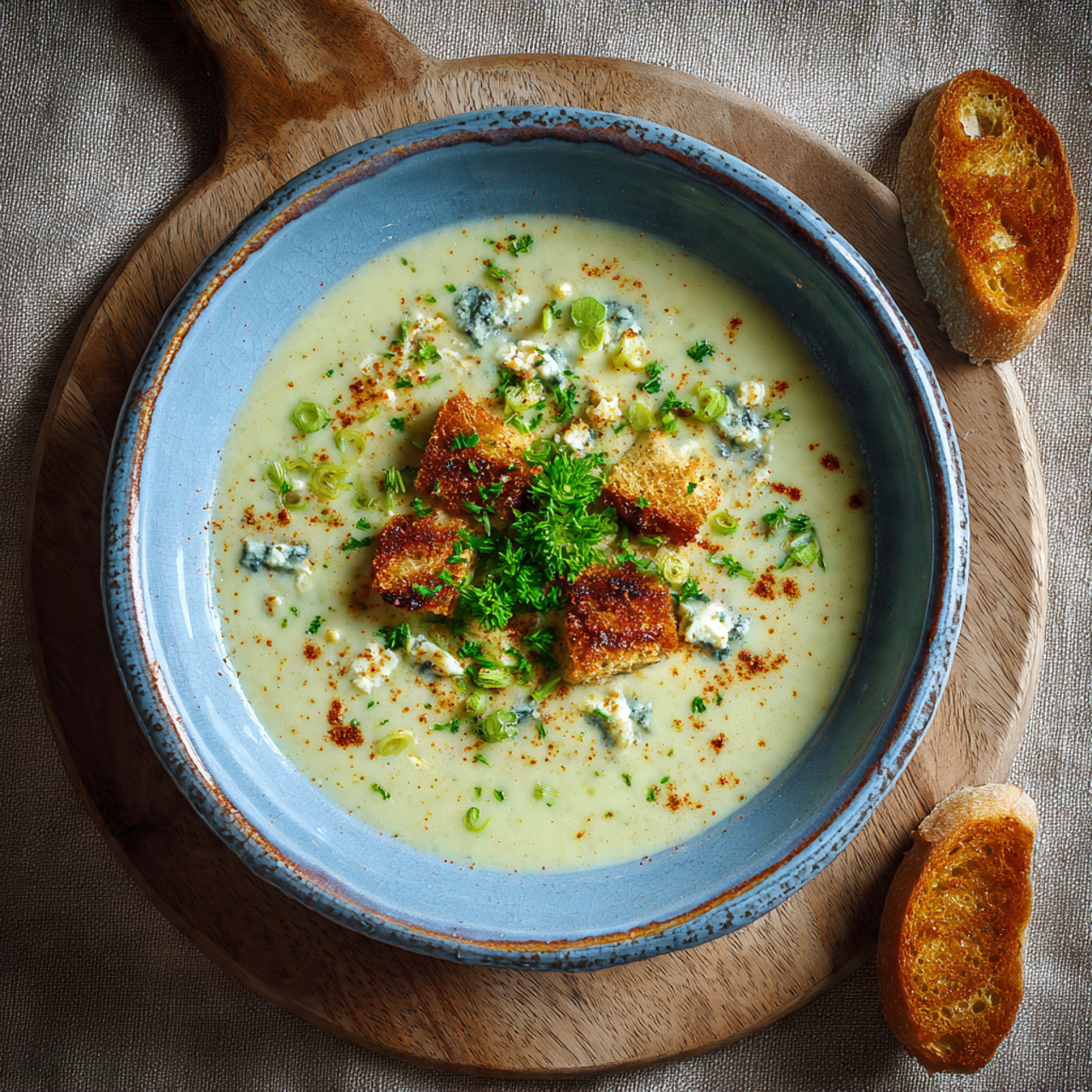 - Garnish and Serve: Ladle the hot, creamy soup into four bowls. Crumble the remaining Stilton over the top, then garnish with the reserved celery leaves, the snipped chives, another grind of black pepper, and a final, elegant drizzle of olive oil.