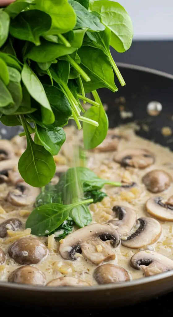 - Make it Creamy: Stir in the heavy cream and bring it to a gentle simmer. Add the fresh baby spinach to the pan in a few large handfuls, stirring after each addition until all the spinach has wilted into the sauce.
