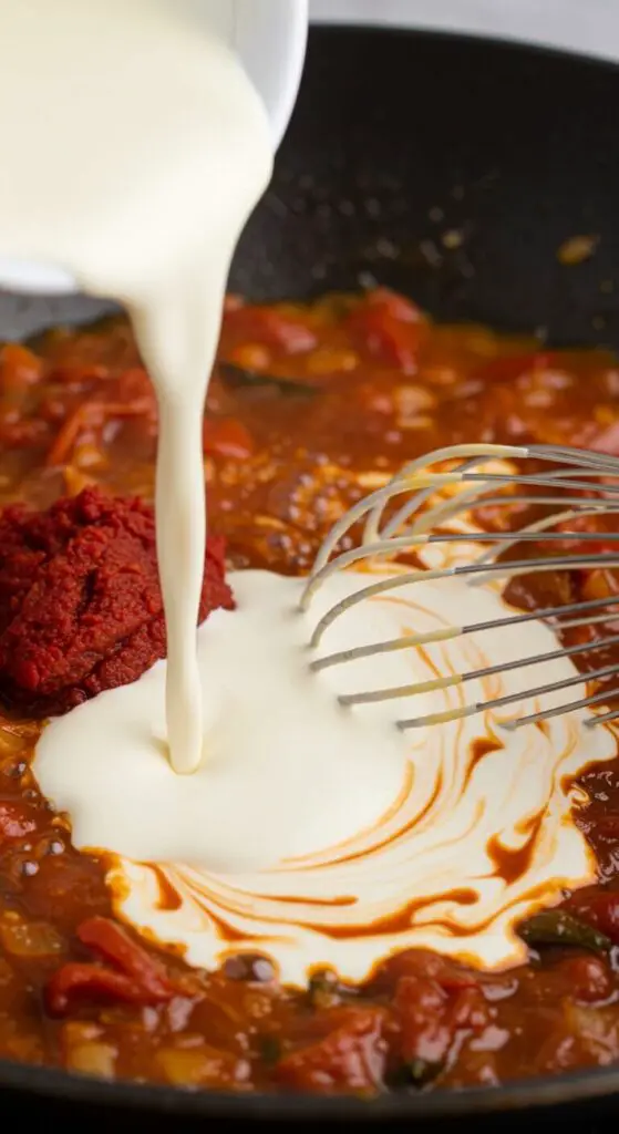 - Build the Chipotle Cream Sauce: Add the reserved 1 cup of pasta water, the finely chopped chipotle chiles, the adobo sauce, and the tomato paste to the skillet. Season with a pinch of salt. Bring it to a simmer, stirring until everything is combined and the tomato paste has dissolved. Slowly stir in the heavy cream.