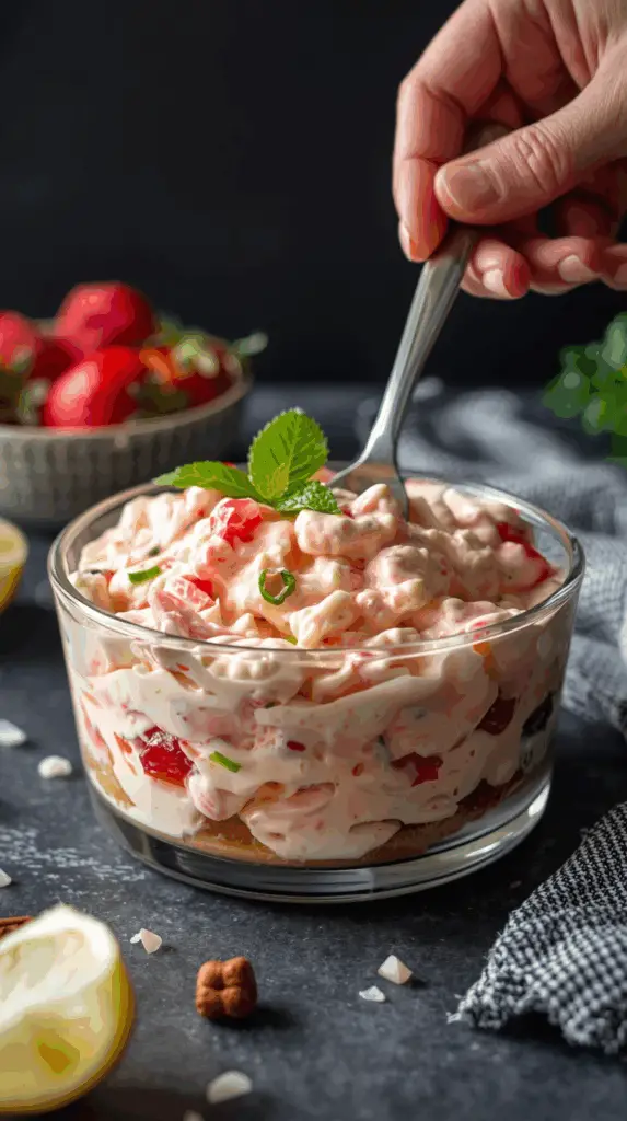 I promise you, there is no greater joy than seeing a bowl of this beautiful, pink, fluffy salad on a dessert table. Each spoonful is a delightful journey of textures—from the creamy mousse to the chunks of sweet pineapple and fresh, juicy strawberries. It’s a light, satisfying treat that feels both indulgent and refreshingly fruity.