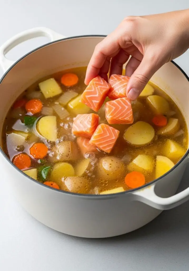 - The Final, Gentle Poach: Now for the most important step! Cut your salmon into 2-inch chunks. Add the salmon pieces to the hot soup at the very end. Let them gently poach in the simmering soup for about 5 minutes (for fresh) or 7 minutes (if adding from frozen), just until the salmon is opaque and flakes easily.