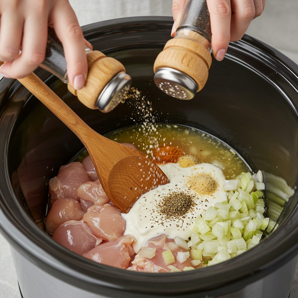 - Combine Initial Ingredients: In the ceramic insert of your large slow cooker, combine your 1 ½ lb. boneless skinless chicken breasts (cut into 1-inch pieces), 1 large chopped onion, 2 cups low-sodium chicken broth, 1 cup heavy cream, 1 teaspoon garlic powder, and 1 teaspoon dried oregano.