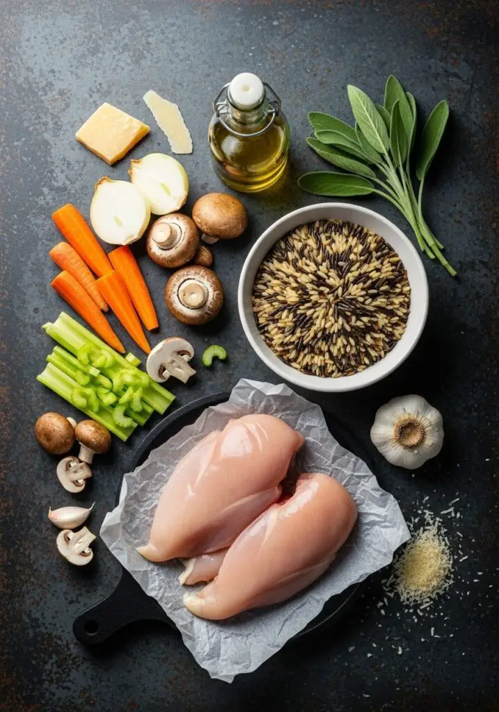 - Layer the Base: In the bowl of your crockpot, combine the wild rice blend, chopped onion, carrots, mushrooms, celery, and dried parsley. Drizzle with 1 tablespoon of olive oil, season generously with salt and pepper, and give it all a good toss. Pour the chicken broth over everything.