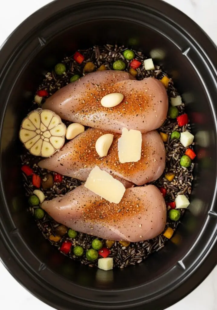 - Load it Up: Nestle the seasoned chicken right on top of the rice and vegetable mixture in the crockpot. Tuck the smashed garlic cloves and the parmesan rind (if you’re using it!) down into the broth.