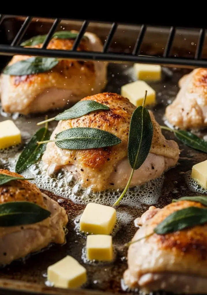 - Create the Herb Butter: Remove the pan from the oven. The butter will be melted and infused with sage. Squeeze the soft, roasted garlic out of its skin, give it a quick chop, and mix it right into the melted butter on the pan. Toss the chicken in this glorious herb butter.