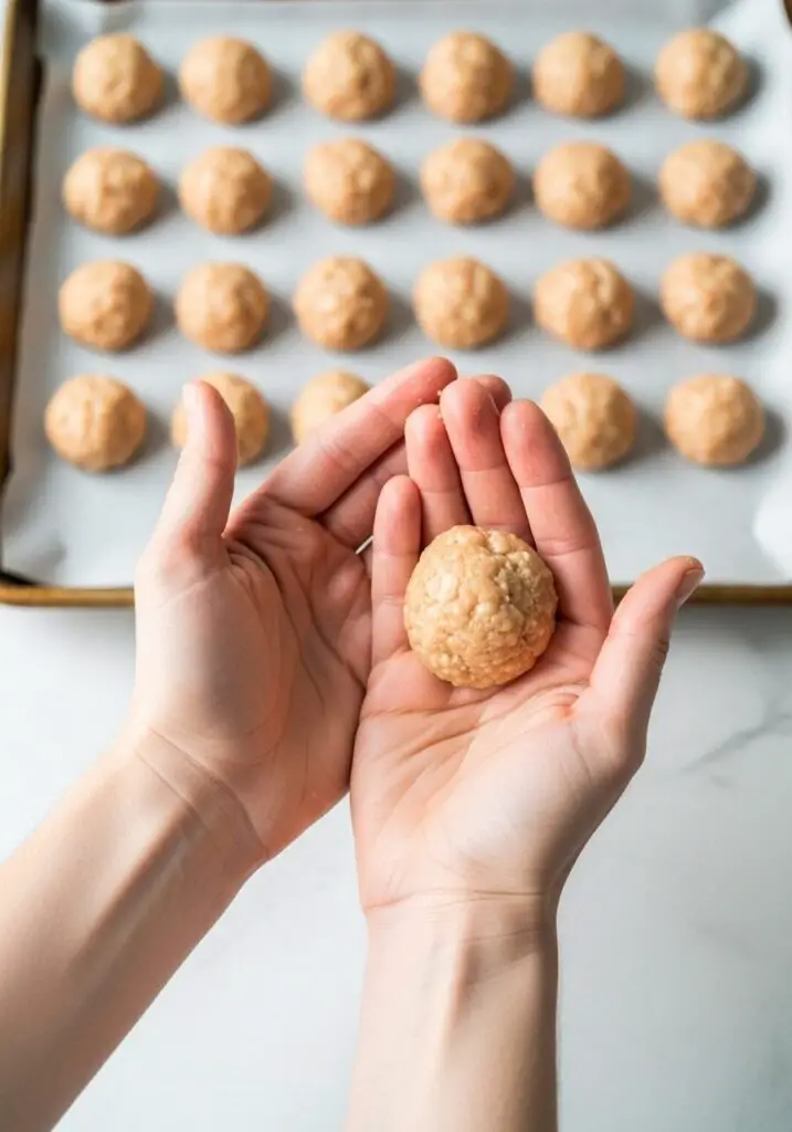 - Scoop and roll the mixture into balls about 2 Tablespoons in size. Place on the prepared baking sheet.